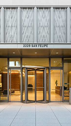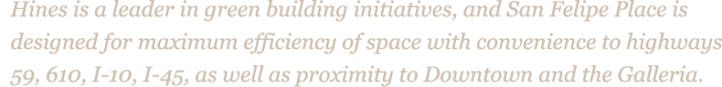 SAN FELIPE PLACE RISES as a community hub for Houston executives, investors and personalized professional service firms—from River Oaks and beyond. The building stands as a commitment to long-term stewards of Houston business. Hines continues its commitment to excellence in architecture at San Felipe Place in partnership with Ziegler Cooper Architects, leaders in green building principles. The building’s low impact LEED® certification makes it a responsible headquarters for those seeking to sustain legacies across generations. San Felipe Place features the dignified lines and restrained scale that make it an ideal business center for the neighborhood while meeting clients’ highest expectations of design and function.